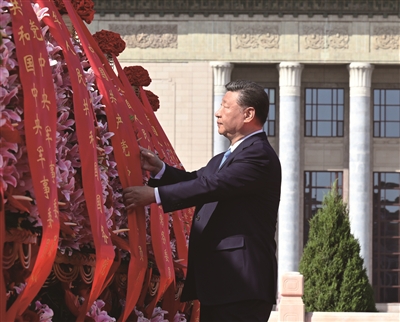 习近平迈步上前,仔细整理花篮缎带。随后,习近平等党和国家领导人缓步绕行,瞻仰人民英雄纪念碑。