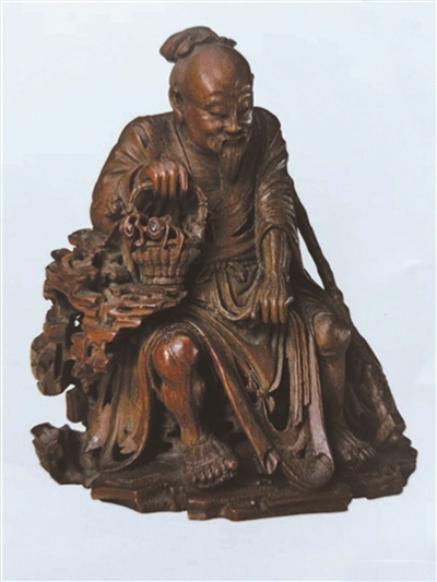此竹根雕采药老人,高14.7厘米,底径12.1厘米,为清代早期制作,现收藏于故宫博物院。此件作品以竹根为材,经过精心雕琢,呈现在人们眼前的采药老人,坐于一块石头上,衣衫有鹑衣之状,挽髻长髯,隆颡方颌,容貌清癯,脚穿草履。其背部微伛,一手扶石上竹篮,一手持下垂绦带,腰间挂着葫芦,采药所用的一把锄头斜倚在身旁,似乎刚刚采完草药,坐在这儿休憩一会儿。他目视下方,若有所思,似乎正在对所采的草药进行思考。从采药老人的手臂、小腿肌肉有虬结现象来看,老人经常外出采药,跋山涉水,辛苦劳累,导致手臂、小腿处肌肉出现肉眼可见的凹凸纹路,体现了野外采药的艰辛。