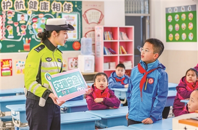 11月30日,在江苏省扬州市江都区实验小学,扬州市公安局江都分局交警大队交警给小学生讲解交通安全知识。 在“全国交通安全日”来临之际,各地开展交通安全进校园活动,为同学们普及交通安全知识,培养交通安全意识。■新华社发