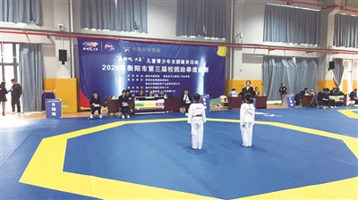 衡阳日报讯(文/图 全媒体记者 敖文景)12月20日,衡阳市第三届校园跆拳道比赛在高岭小学火热开赛。来自全市各中小学的500余名“跆拳小将”汇聚一堂,在品势与竞技等项目中展开激烈角逐,现场气氛高涨、活力四射。