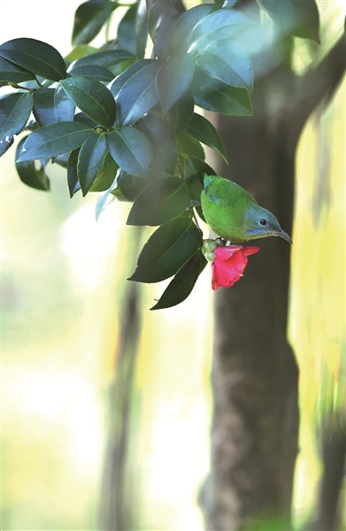 除了出众的颜值,橙腹叶鹎还是鸟类中的“模仿高手”,鸣声婉转多变,常常效仿其他鸟类的叫声,让观鸟人在“听音辨鸟”时屡屡“翻车”。作为国家“三有”保护动物,它们偏爱低山阔叶林与针阔混交林,以昆虫、植物果实和种子为食,此次在衡山茶花、柿树间的取食画面,也恰好印证了其食性与栖息偏好。