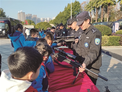 1月9日上午,市公安局前坪欢声笑语不断。一场别开生面的“警营开放日”活动在此开启。来自祝融小学的180余名师生走进警营,近距离触摸警务装备、感受警务魅力,沉浸式学习安全知识,开启了一段奇妙的“平安启蒙”之旅。“哇!无人机好酷!”“警犬好威风!”刚踏入活动现场,整齐陈列的警航装备、特种车辆就吸引了孩子们的目光,大家纷纷踮起脚尖、伸长脖子,好奇地围观。在警务人员的细致讲解下,孩子们依次参观了警航及反制装备、警犬技术团队、各类武器装备和特种车辆,不时发出阵阵惊叹。当看到威武的警犬做出精准的搜爆演示时,现场更是响起热烈的掌声。警务技能展示环节将气氛推向高潮。无人机精准完成定点抛投,动作流畅利落;警犬在训导员的指令下,迅速完成搜爆、扑咬等科目,尽显“无言战友”的专业与忠诚;警棍盾牌操表演一招一式刚劲有力,让孩子们直观感受到警察叔叔守护平安的强大力量。师生们走进情报指挥中心大厅,通过观看介绍片,了解公安机关接警处警流程和大数据赋能警务工作的奥秘。警务人员结合真实案例,用通俗易懂的语言讲授校园安全、防拐骗等知识,并通过互动提问加深孩子们的理解。