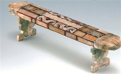 徐州狮子山楚王陵一个陪葬墓出土的玉枕——食官监玉枕,整体像一个长条板凳,表面镶有35块玉片,两端装饰有兽头,枕腿像一个“工”字,显得强劲有力。枕板内为一长方形木枕芯,上面镶饰有35片雕琢精美的龙形、长方形、“亚”字形等玉片,枕板两端为兽头状玉饰。