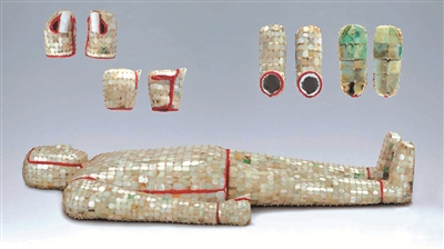 一般认为,汉代的玉衣随葬是从前代的葬玉方式发展而来,从西周时期的玉覆面开始,历经玉面罩、玉头套、玉衣套,最后才发展成全身覆盖玉片的完整六件套玉衣,也就是:一个头罩、前后衣片、两个袖筒、一副手套、两个裤筒和一双鞋套。