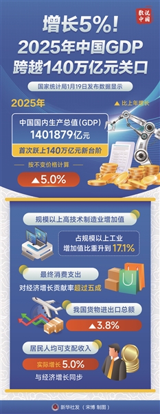 国家统计局1月19日发布数据显示,2025年中国国内生产总值(GDP)1401879亿元,首次跃上140万亿元新台阶,按不变价格计算,比上年增长5.0%。