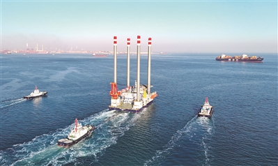 1月22日,由中船武汉船机海西重机自主设计建造的两座新一代“海上移动岛”——TYPE3 PRO型自升式海上作业支持平台,从青岛西海岸新区启航,发往中东波斯湾海域交付。该型平台集作业高效、绿色环保与网络安全等先进性能于一身。 ■新华社发