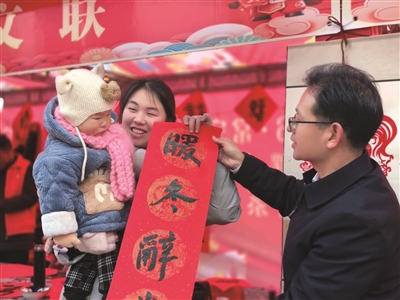 近日,2026常宁市“衣‘常’温暖 ‘宁’聚年味”促消费系列活动在市政府广场火热启幕,常宁市文联2026新时代新春联“百千万”艺术工程惠民活动暨“强基工程”助力基层精神文明建设行动同步进行。图为文艺工作者向群众免费派送春联。 ■通讯员 张双胜 摄