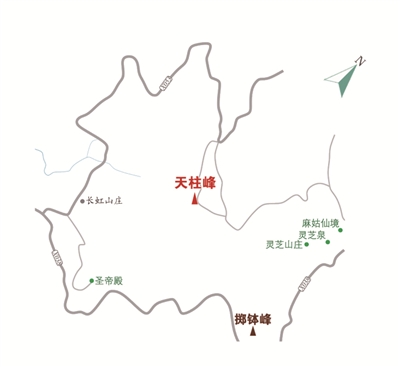 情侣路线 由西岭入口进入中心景区,过藏经殿,登爱情阶梯达天柱峰。