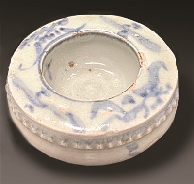 这件形制像烟灰缸的青花瓷水浮司南,扁圆柱形,鼓腹,底和内壁十分厚重,表面和周边描绘青花纹饰的图案,釉面泛青,属明代早期青花瓷。青花图案如疏通标志,寓意吉祥,寄托了人们对航海畅通无阻的美好祝愿,这些艺术元素使得水浮司南成为一件兼具实用性和艺术性的珍贵文物。
