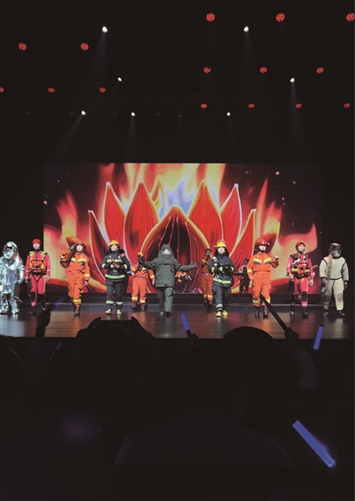 蓝雁乐队的成员都是衡阳一线消防救援人员,他们卸下抢险救援的“铠甲”,拿起乐器、站上舞台,既展现自我风采,更传递消防安全知识,让“预防为先”的理念随旋律浸润人心。演出现场,《逆战》的激昂旋律搭配模拟火焰特效,点燃全场的同时,传递出“火场如战场”的无畏信念;改编版《武家坡》中,消防火调员与湘剧演员跨界合作,唱出消防员对家人的愧疚与牵挂,让观众读懂“逆行者”的铁骨与柔情。