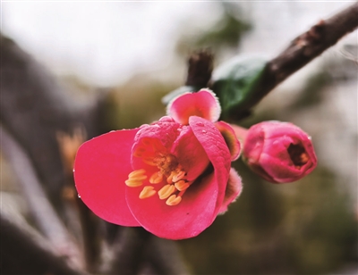 2月16日下午,天气阴冷,细雨霏霏,在岳屏公园东门游道一侧,贴梗海棠已凌寒绽放,猩红的花瓣簇拥着金黄的花蕊,枝杈间密密匝匝的花骨朵含苞待放,淡淡的清香在雨雾中若隐若现。岳屏公园相关负责人介绍说,由于天气偏暖,今年贴梗海棠的开花时间较往年有所提前。
